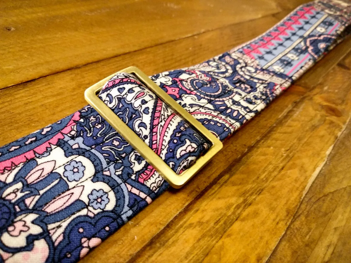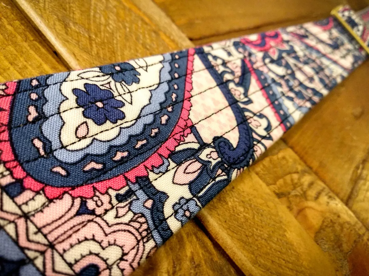 Antique 'n' Sleek guitar strap, handmade, real leather ends, blue, white and pink colours - Sexy Straps by Revel ThreadsAntique ‘n’ Sleek Guitar Strap
