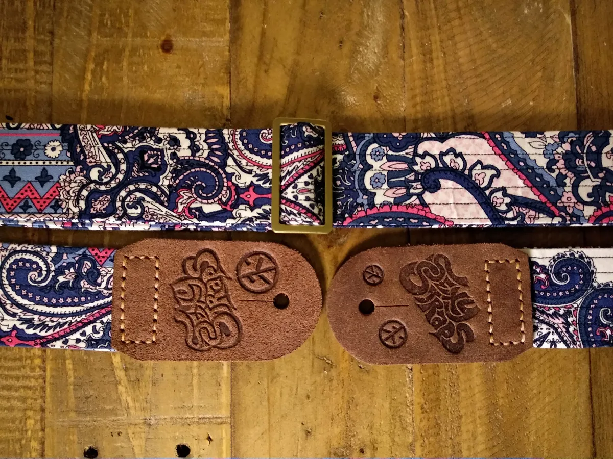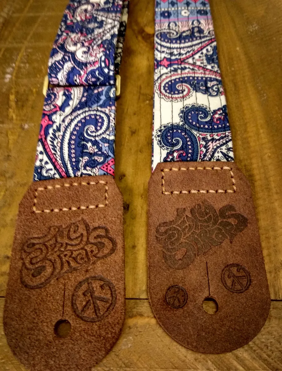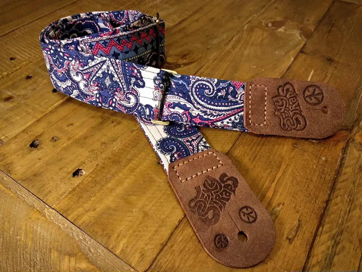 A sophisticated paisley guitar strap with vintage flair, featuring hand-stitched leather ends, metal hardware, and built-in plectrum holders. Handmade in Sheffield, UK.
