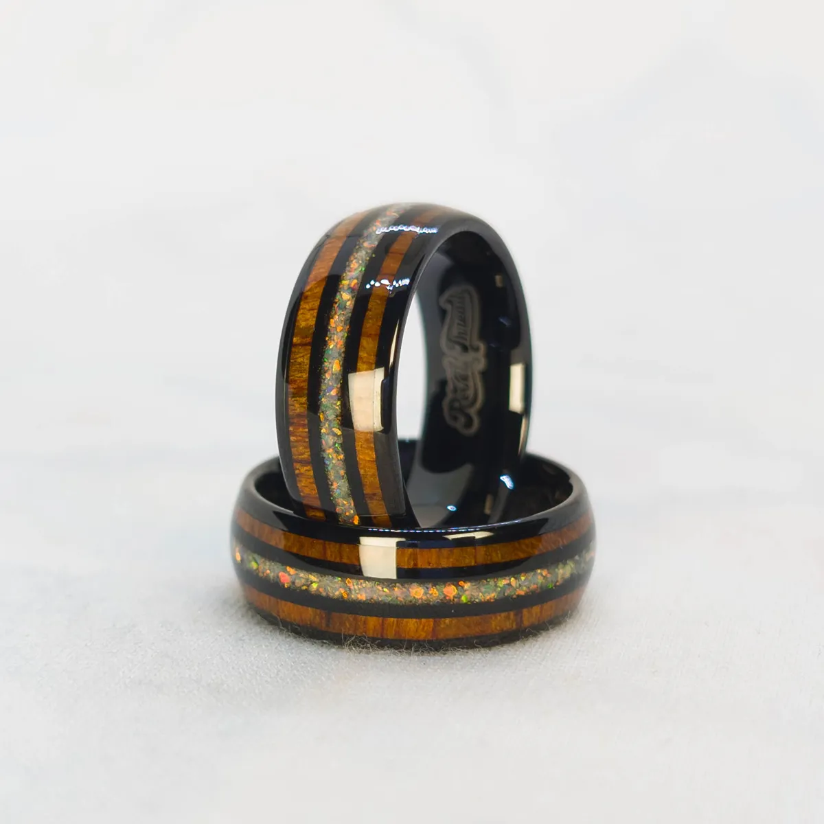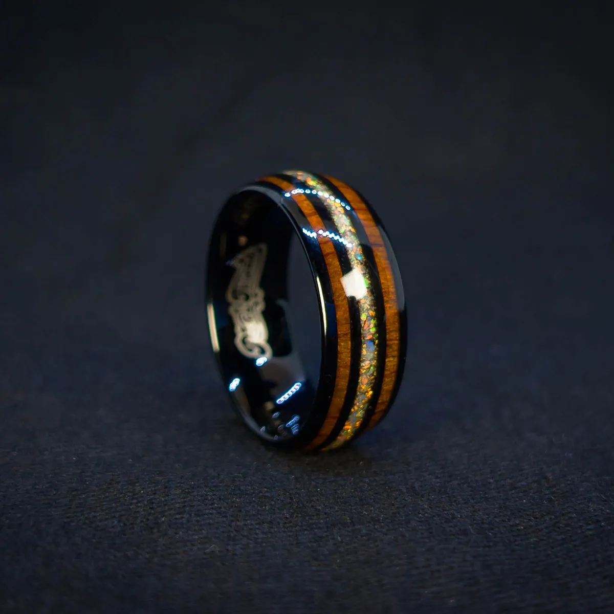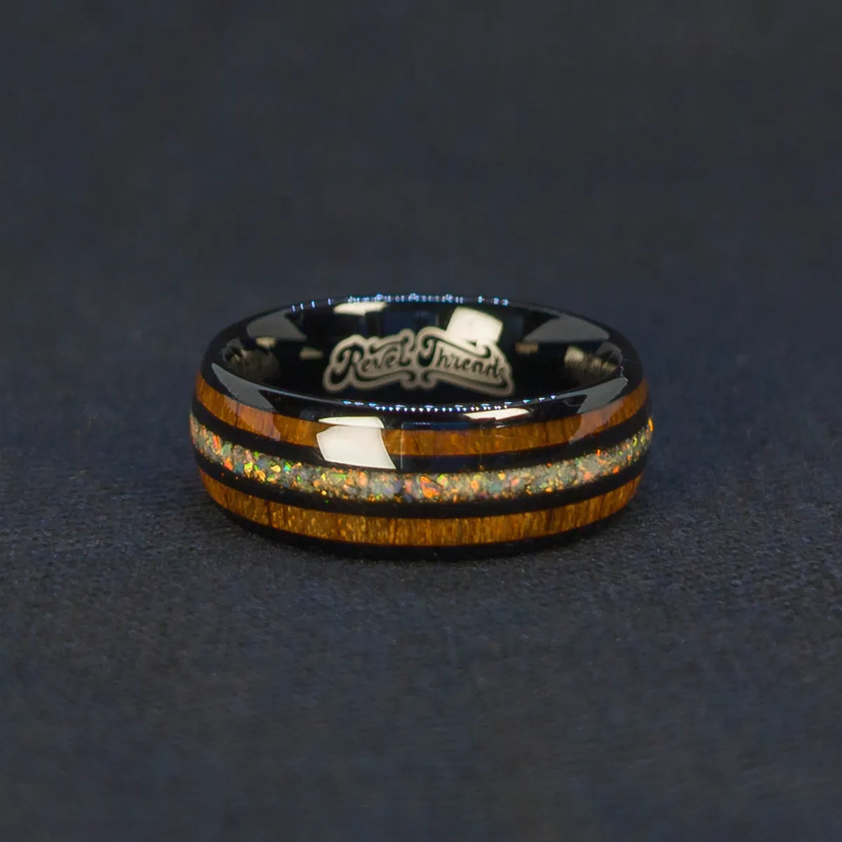+ Free ShippingBlack tungsten carbide with rounded edges, twin wood inlays, and a fiery crushed opal core. Earth and flame in balance.