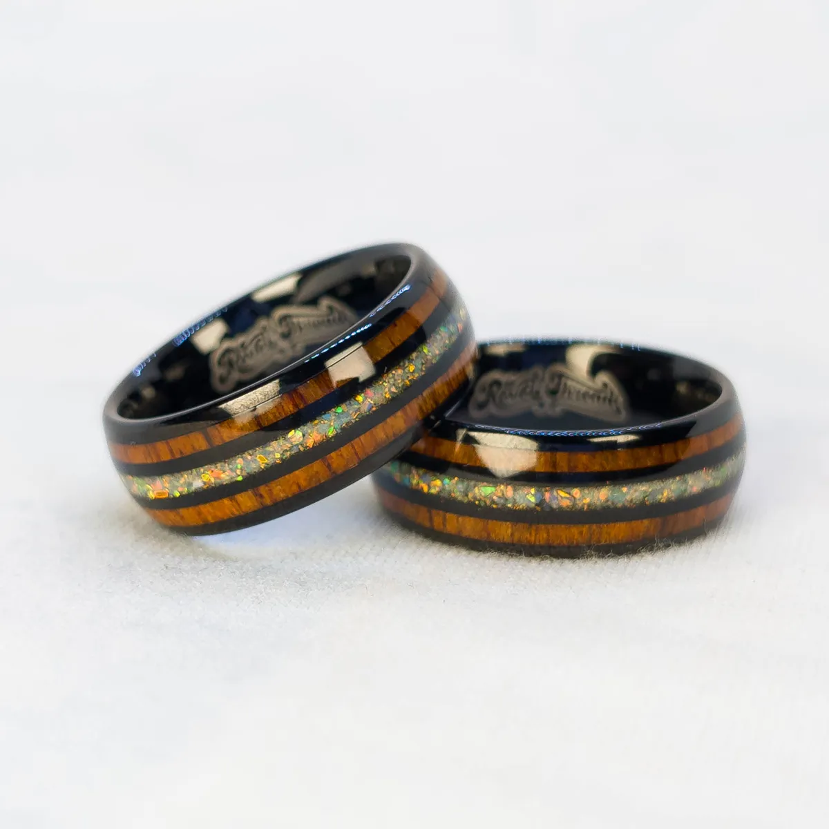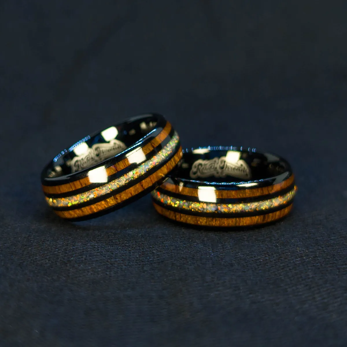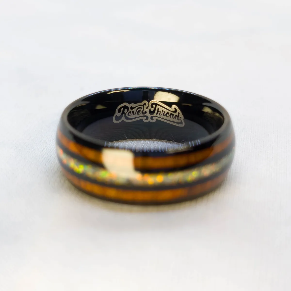 + Free ShippingBlack tungsten carbide with rounded edges, twin wood inlays, and a fiery crushed opal core. Earth and flame in balance.