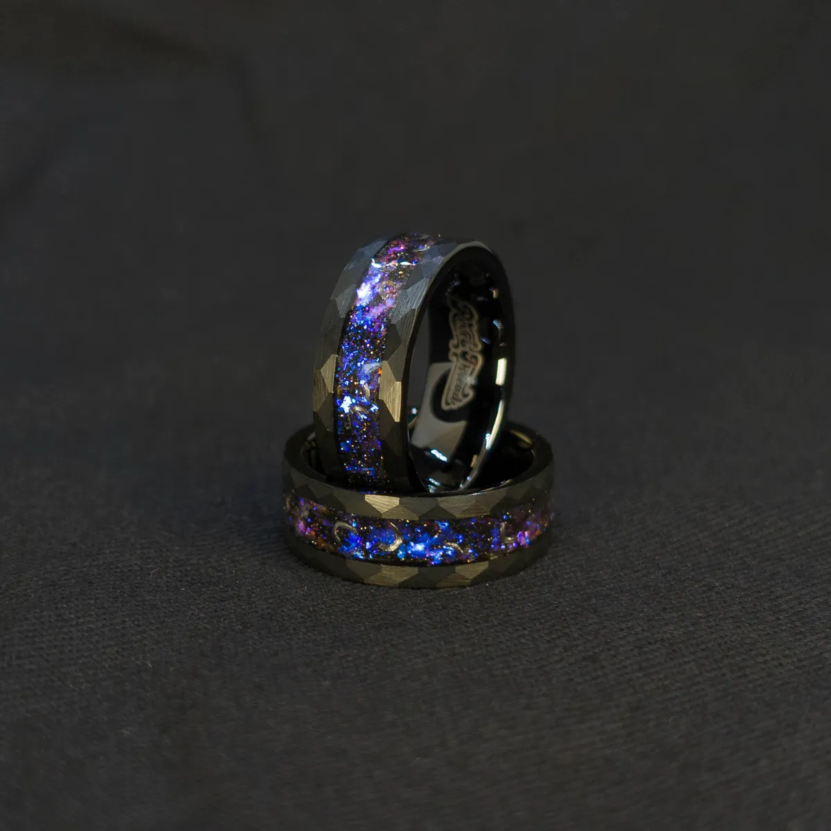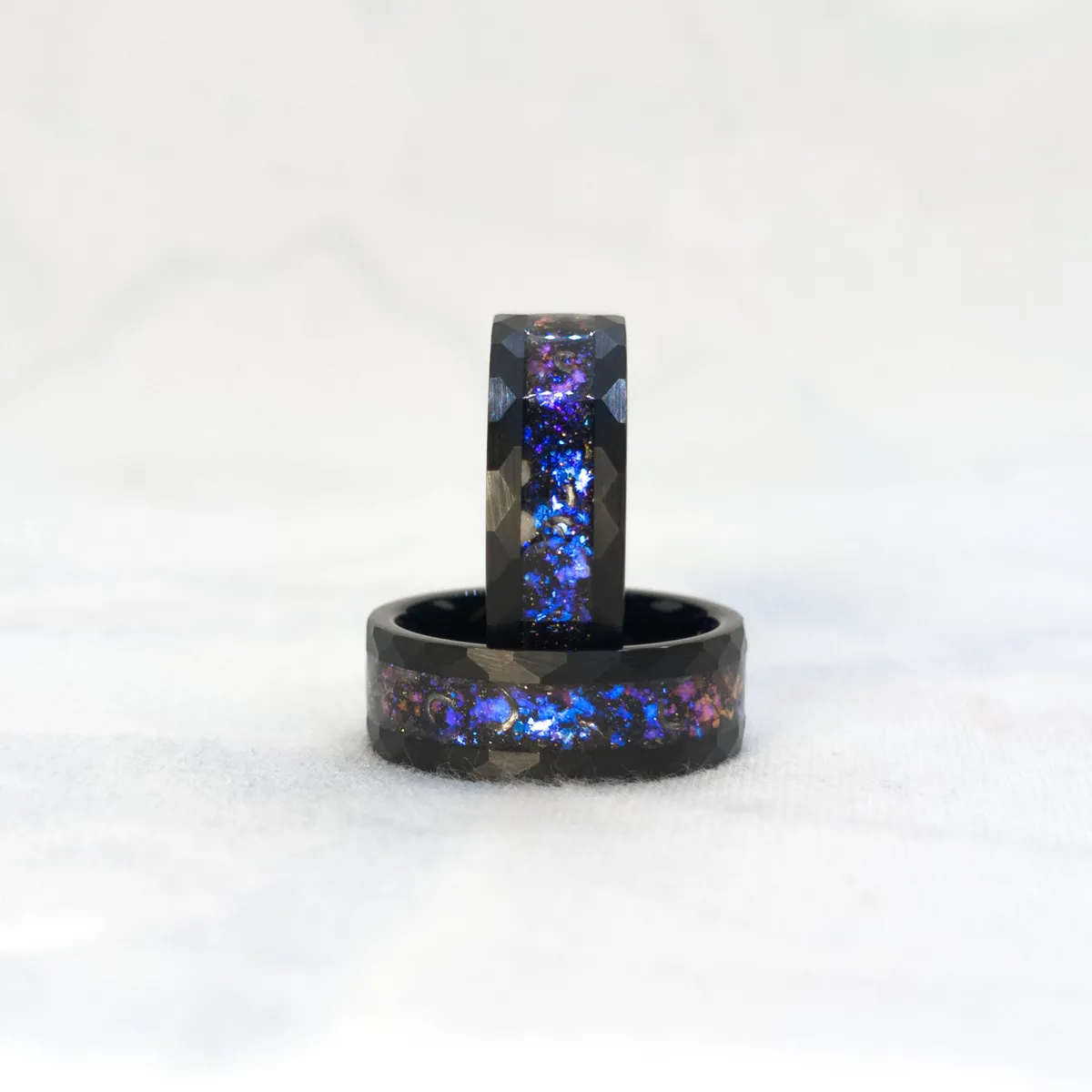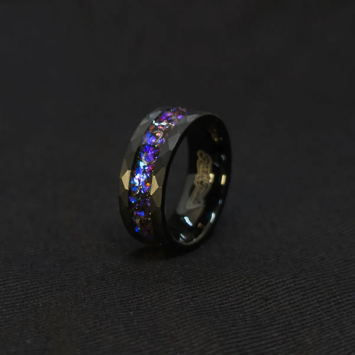 A striking black ring with meteorite fragments and a nebula inlay of blue, purple, and red tones. This cosmic-inspired men’s ring blends celestial beauty with bold design — perfect as a unique wedding band or statement piece.