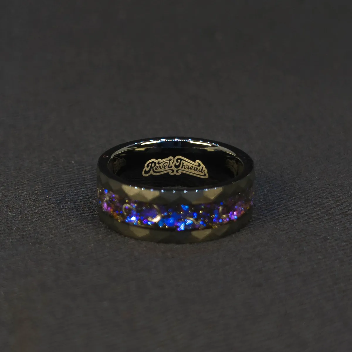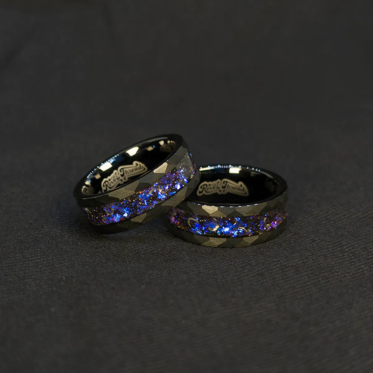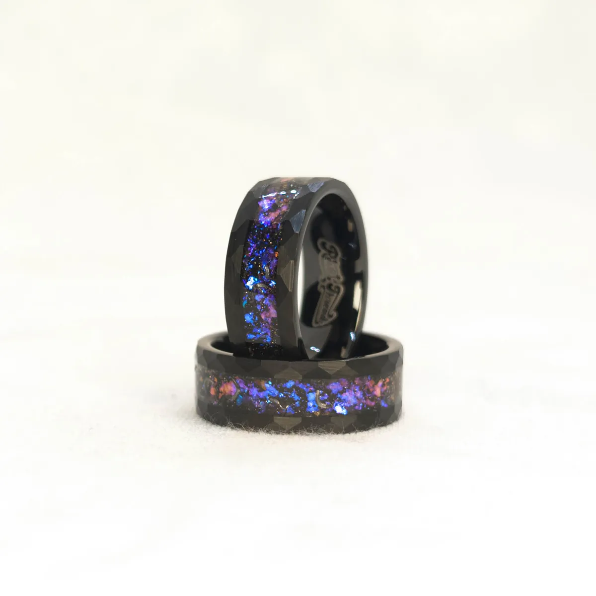 A striking black ring with meteorite fragments and a nebula inlay of blue, purple, and red tones. This cosmic-inspired men’s ring blends celestial beauty with bold design — perfect as a unique wedding band or statement piece.