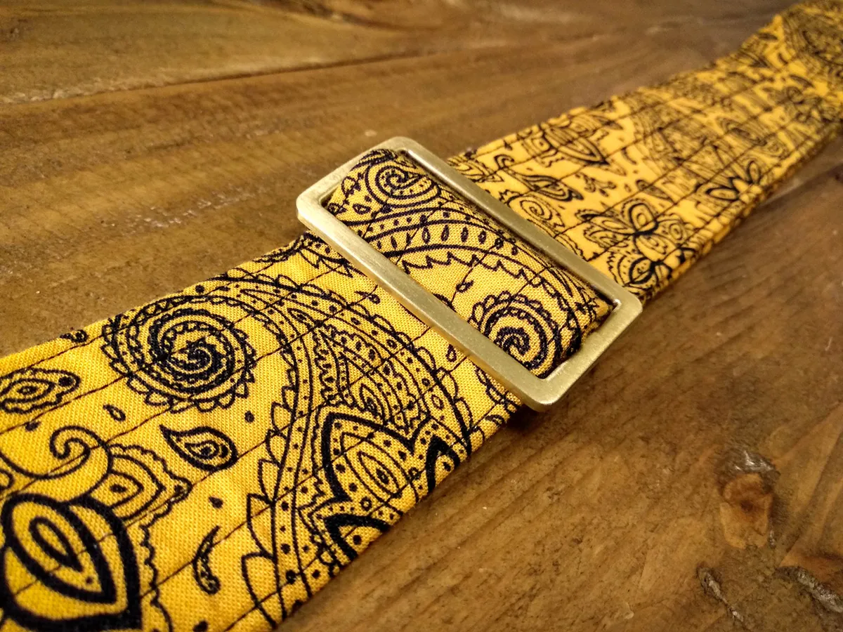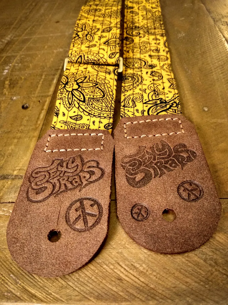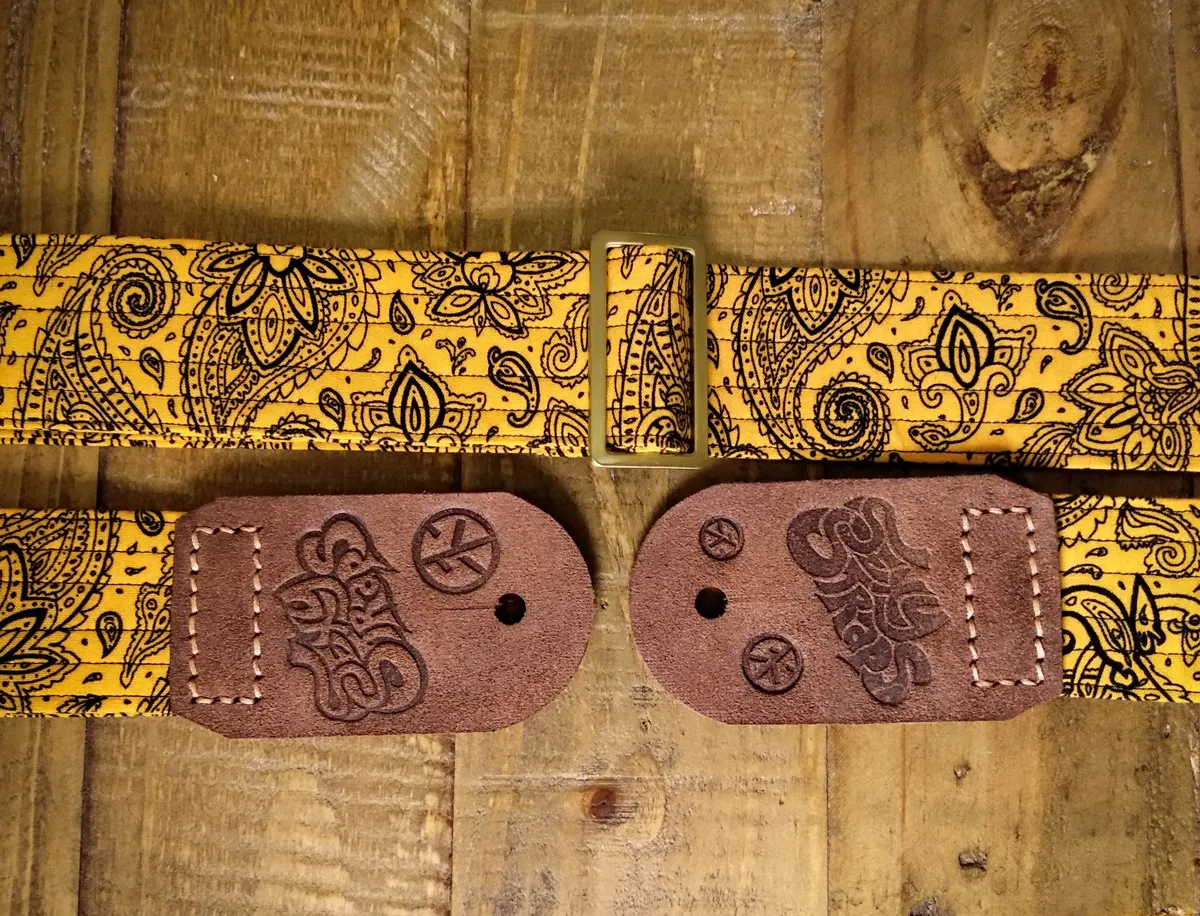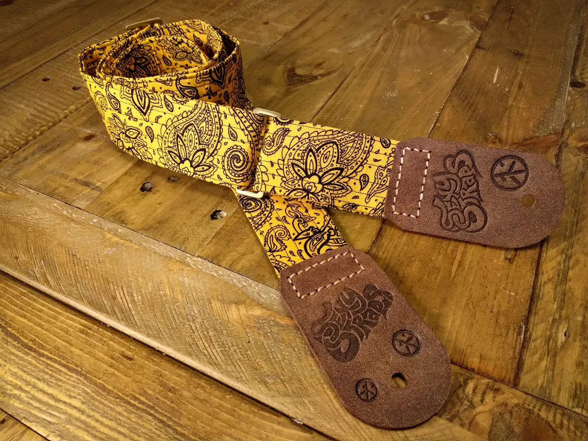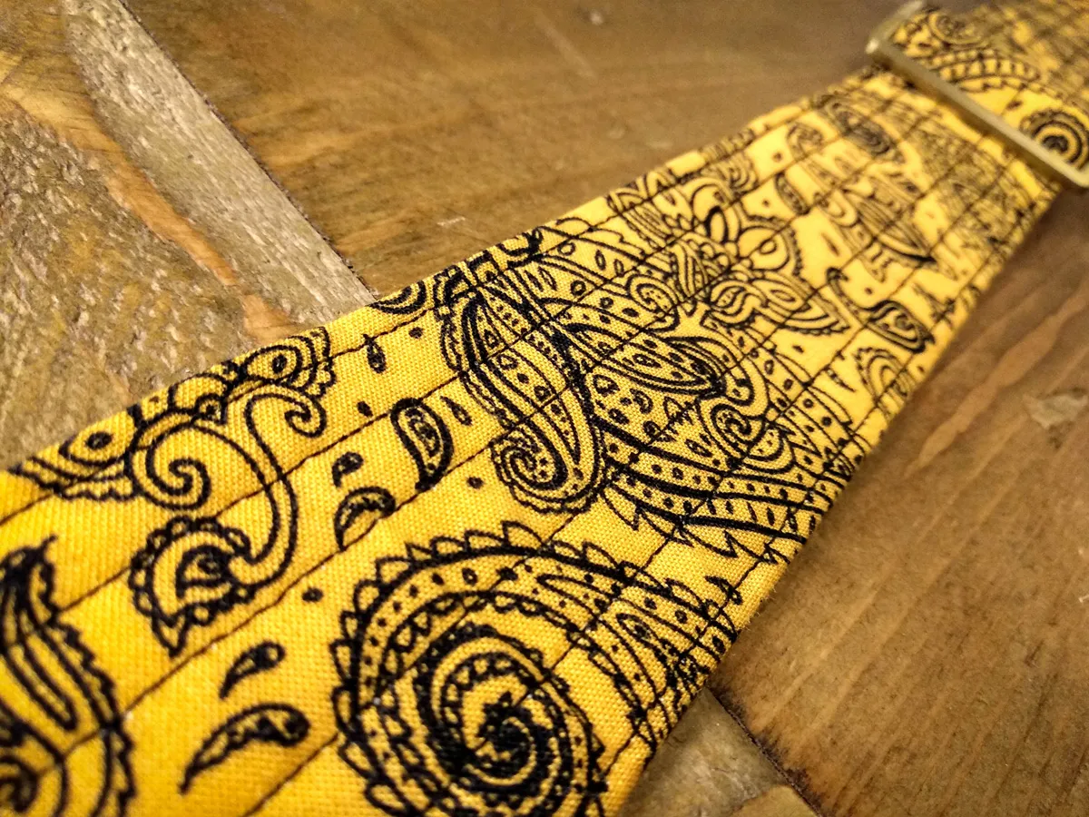 Kernel Mustard guitar strap, handmade, real leather ends, yellow and black paisley colours - Sexy Straps by Revel ThreadsKernel Mustard Guitar Strap
