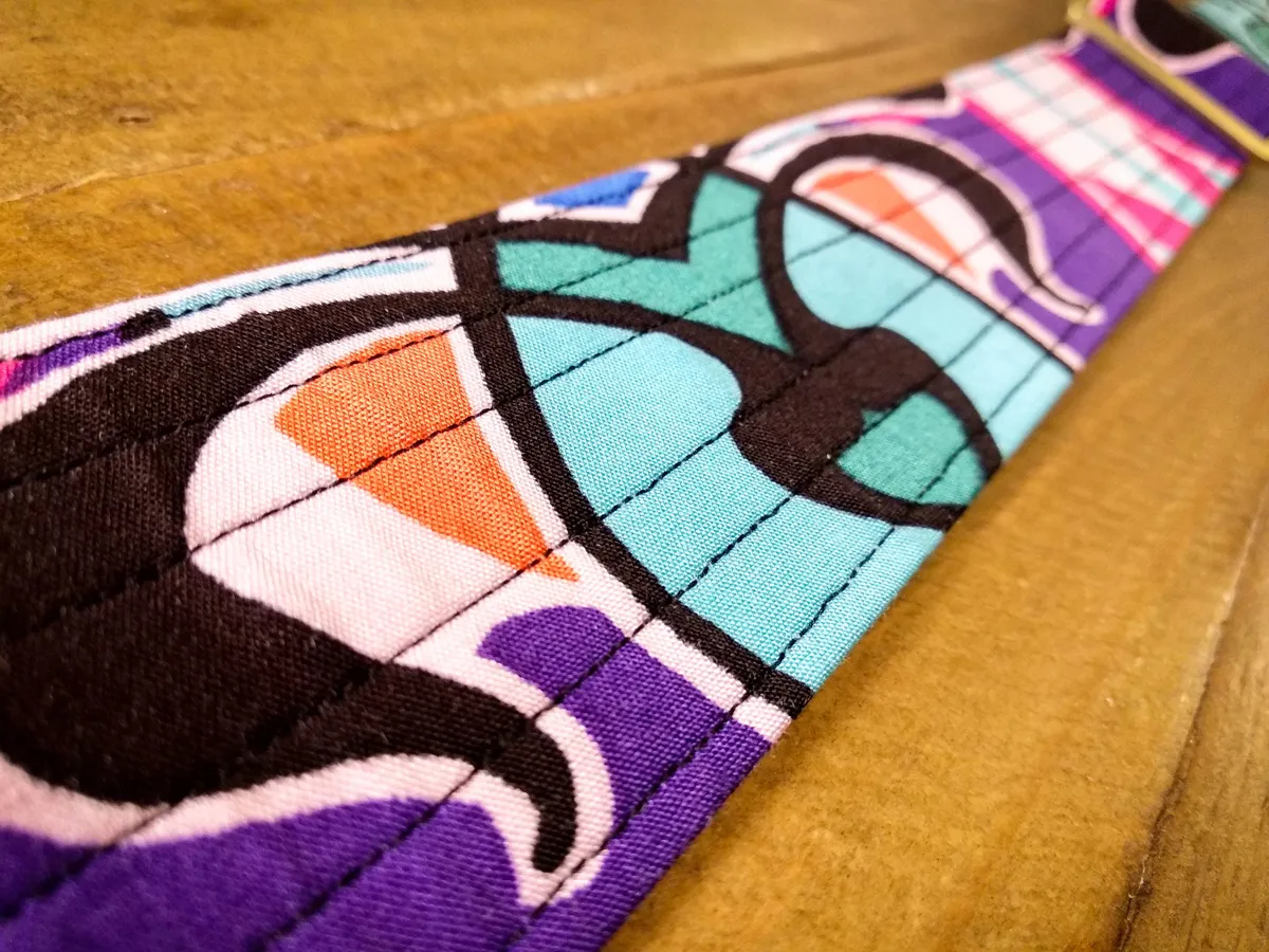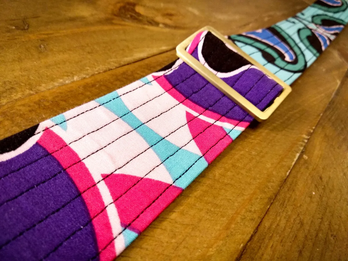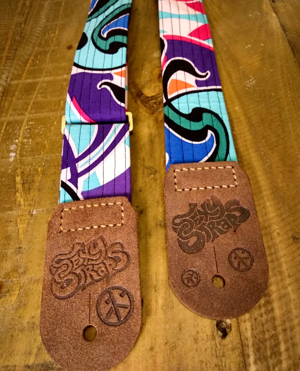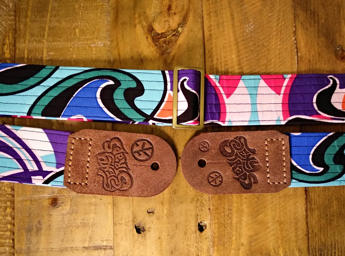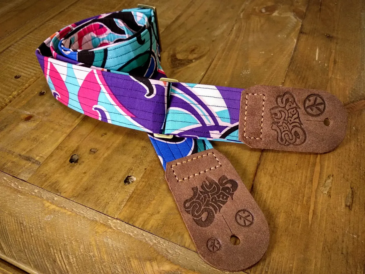 Psychedelic Surfer guitar strap, handmade, real leather ends, light blue, purple, pink (bold) colours - Sexy Straps by Revel ThreadsPsychedelic Surfer Guitar Strap