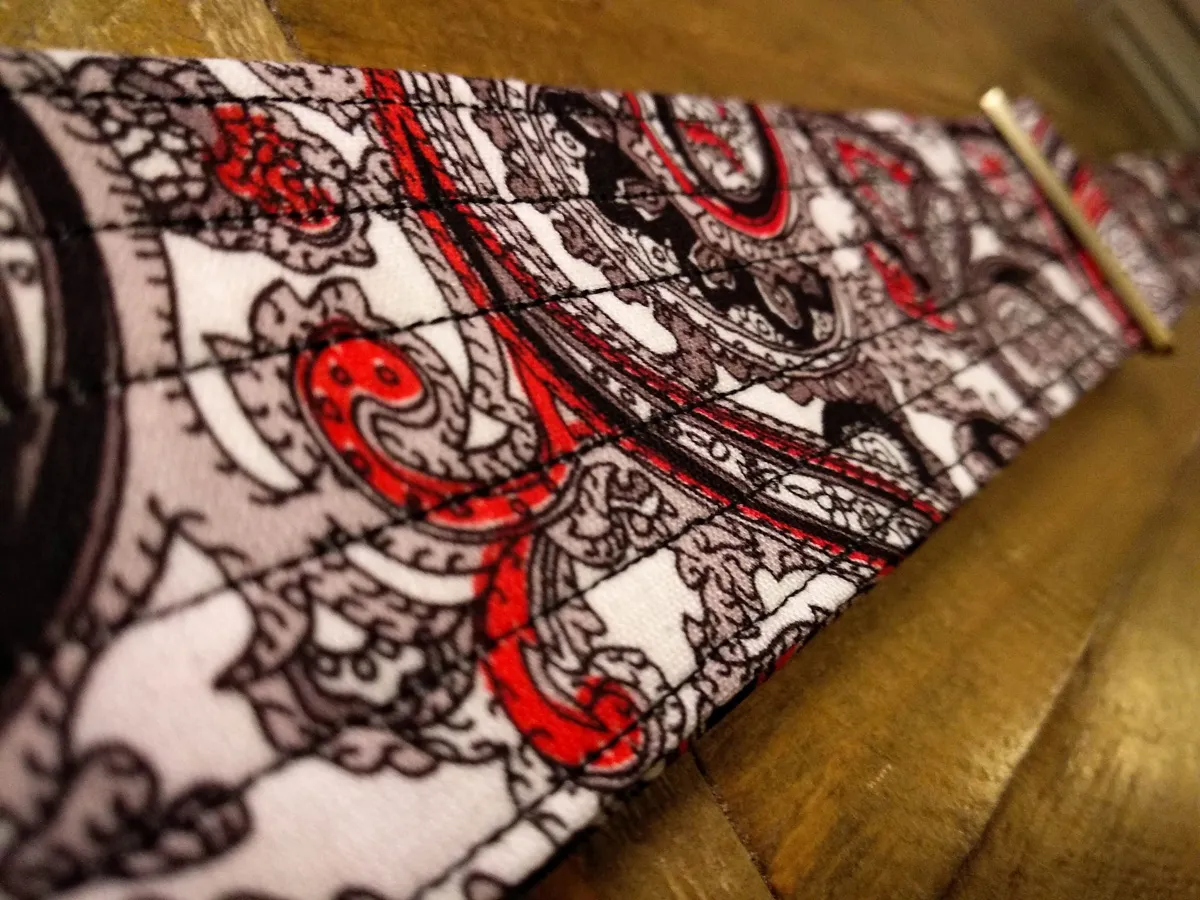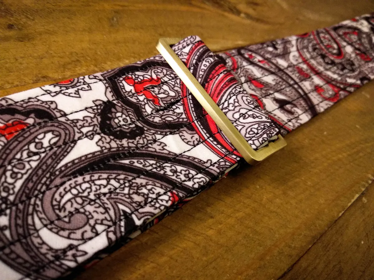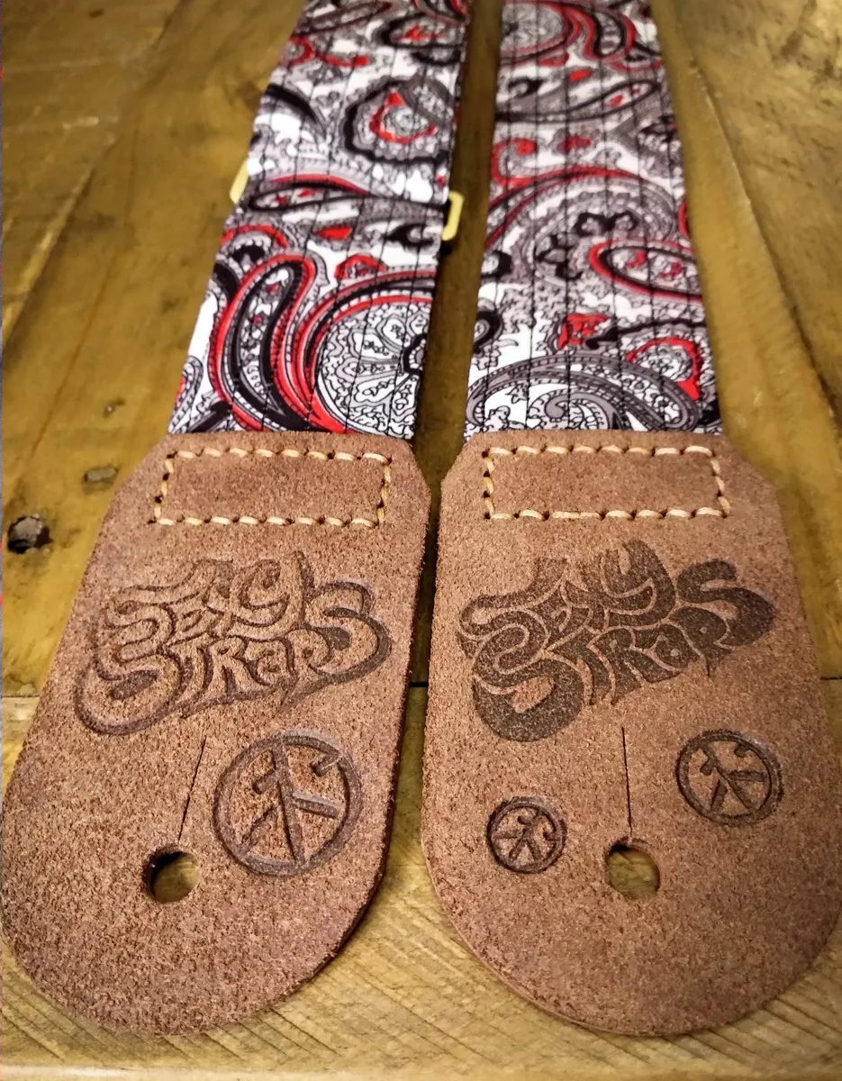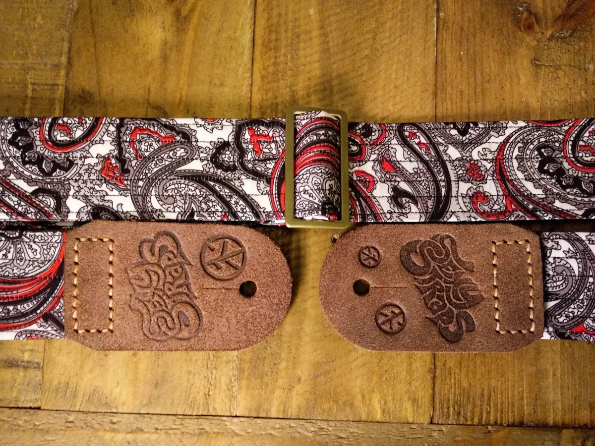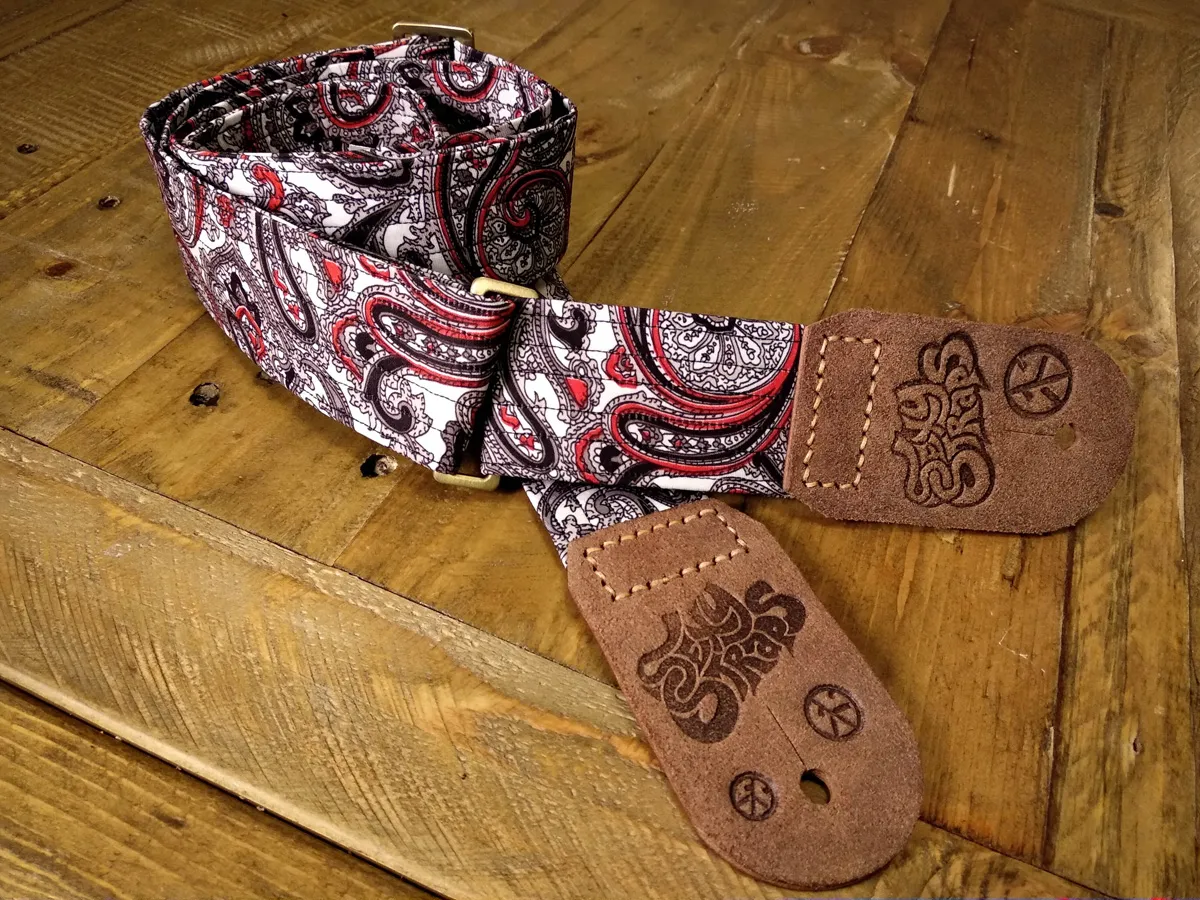 Vintage Vibes guitar strap, handmade, real leather ends, red and black paisley on white colours - Sexy Straps by Revel ThreadsVintage Vibes Guitar Strap