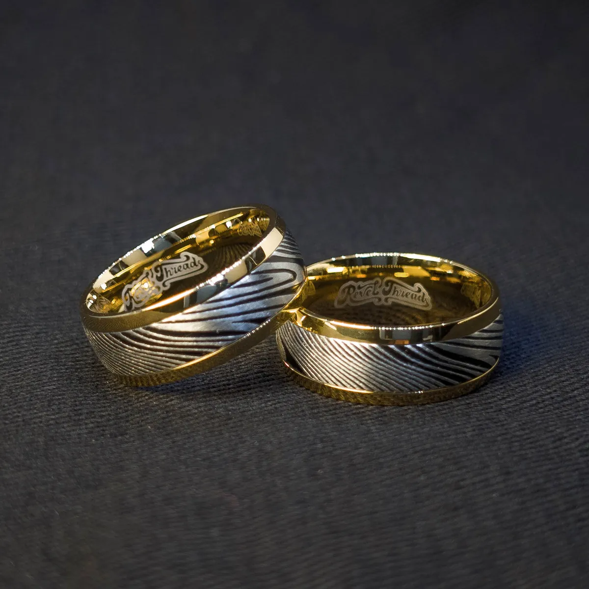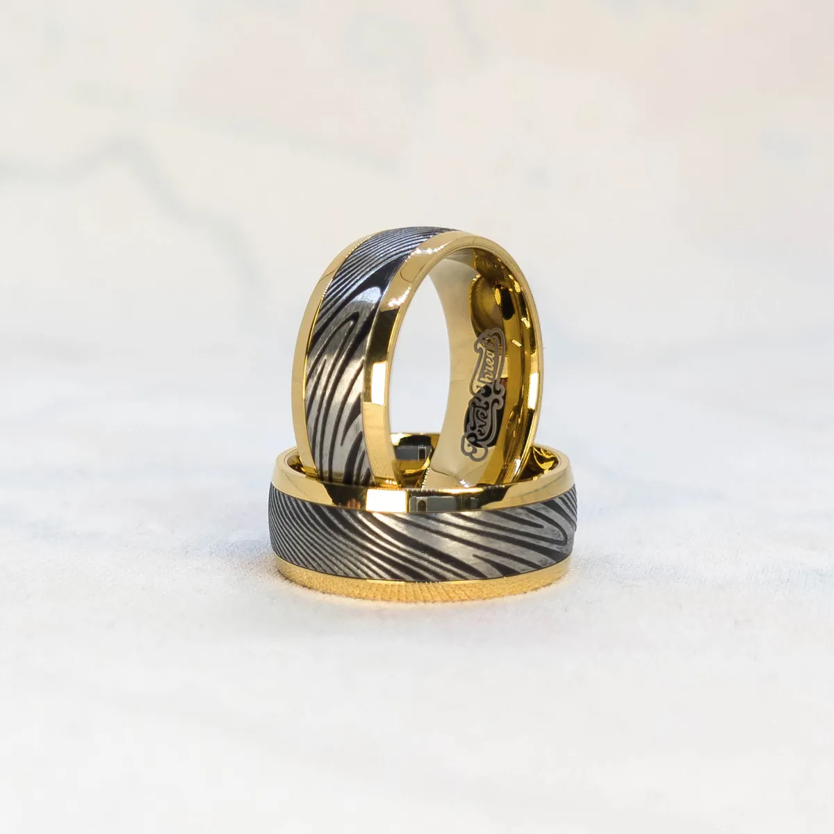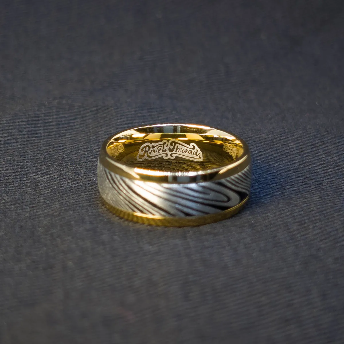 + Free ShippingA gold ring split by a bold black and steel-toned stripe inspired by Damascus steel. Confident, modern, and unmistakable.
