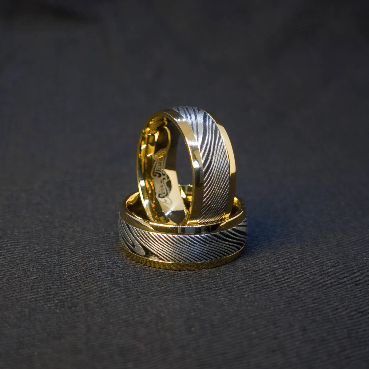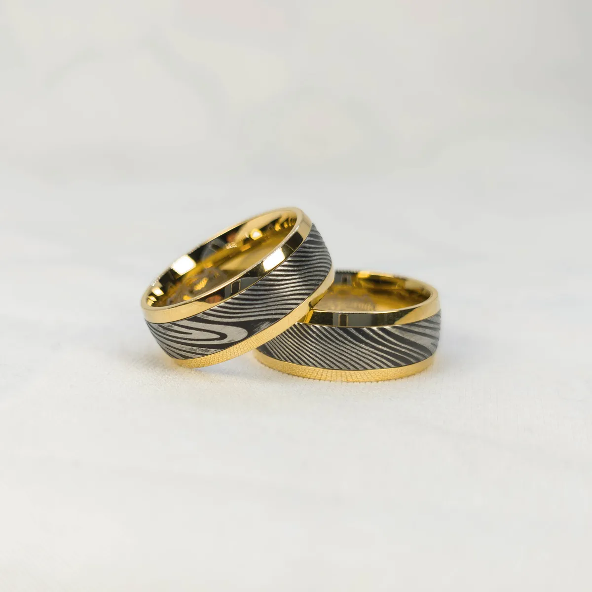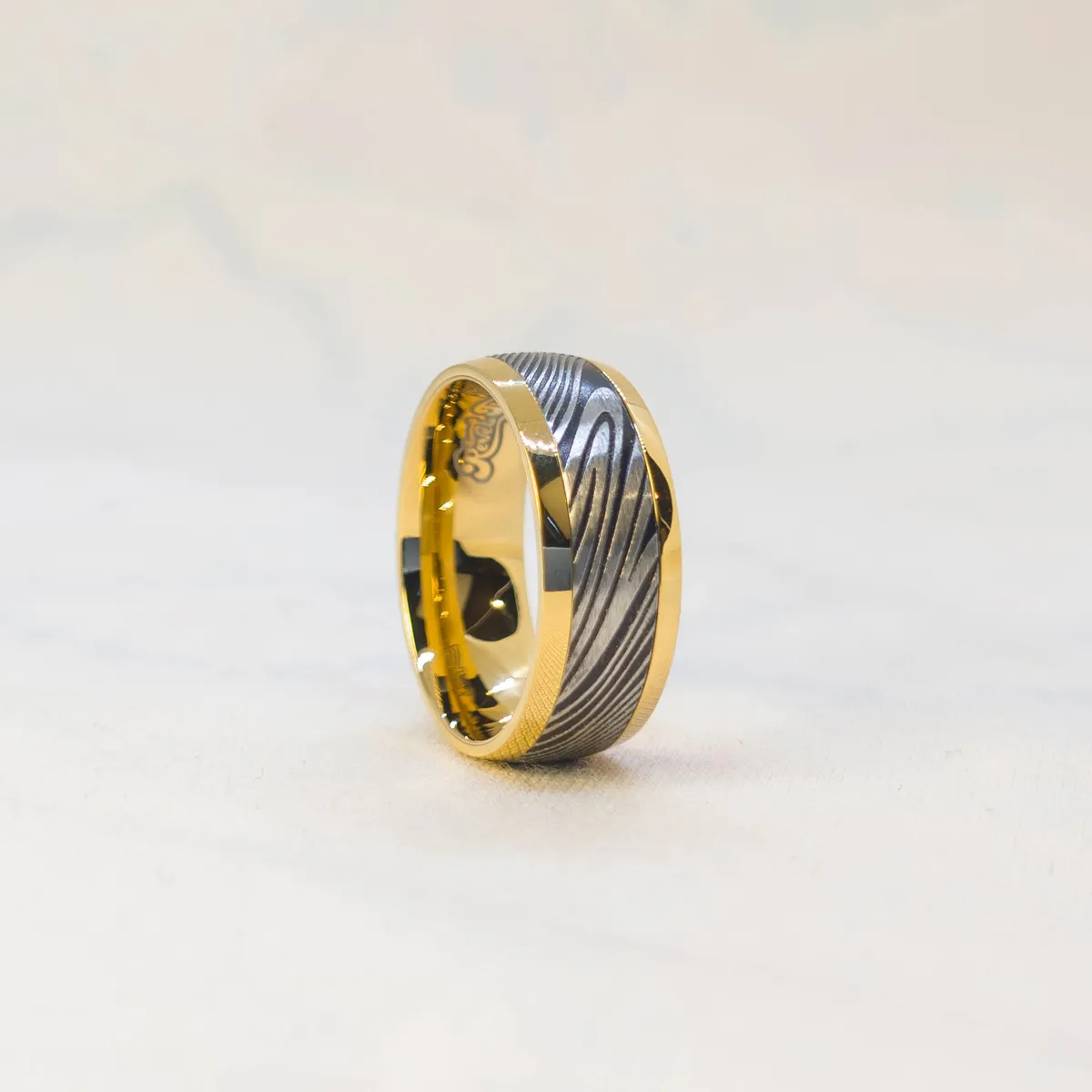 + Free ShippingA gold ring split by a bold black and steel-toned stripe inspired by Damascus steel. Confident, modern, and unmistakable.
